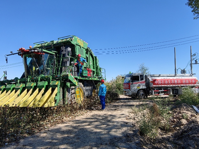 中石油新疆销售加油站为正在巴州棉田作业的采棉机送来“及时油”。