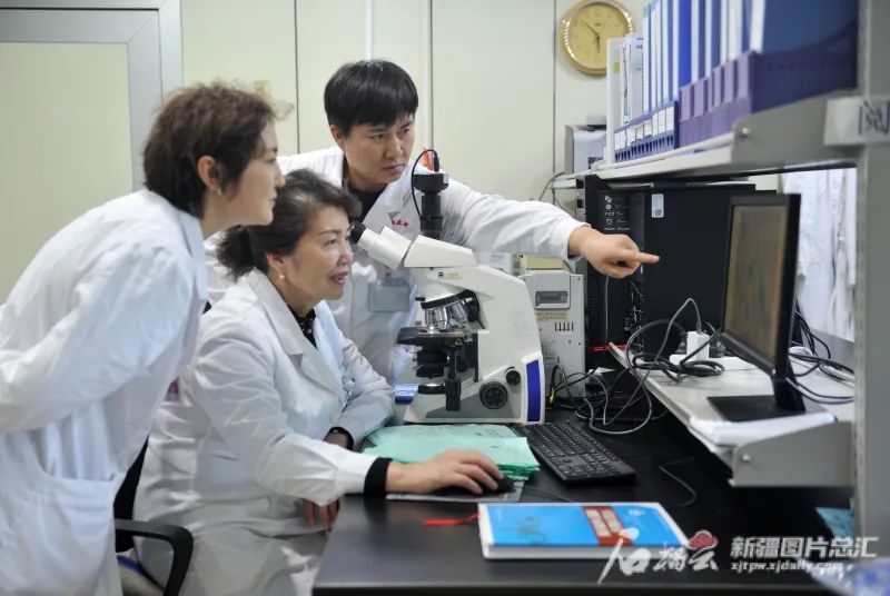 11月1日,自治区人民医院妇产科研究室,玛依努尔·尼牙孜(中)和她的团队进行宫颈细胞图像分析