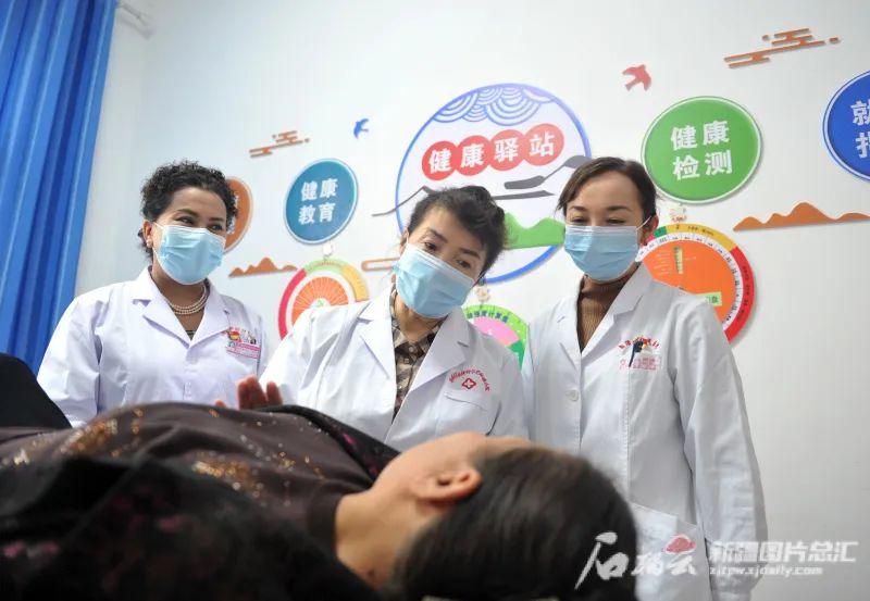 11月2日,洛浦县恰尔巴格镇阔恰艾日克村卫生室,玛依努尔·尼牙孜(中)给村民做宫颈癌筛查
