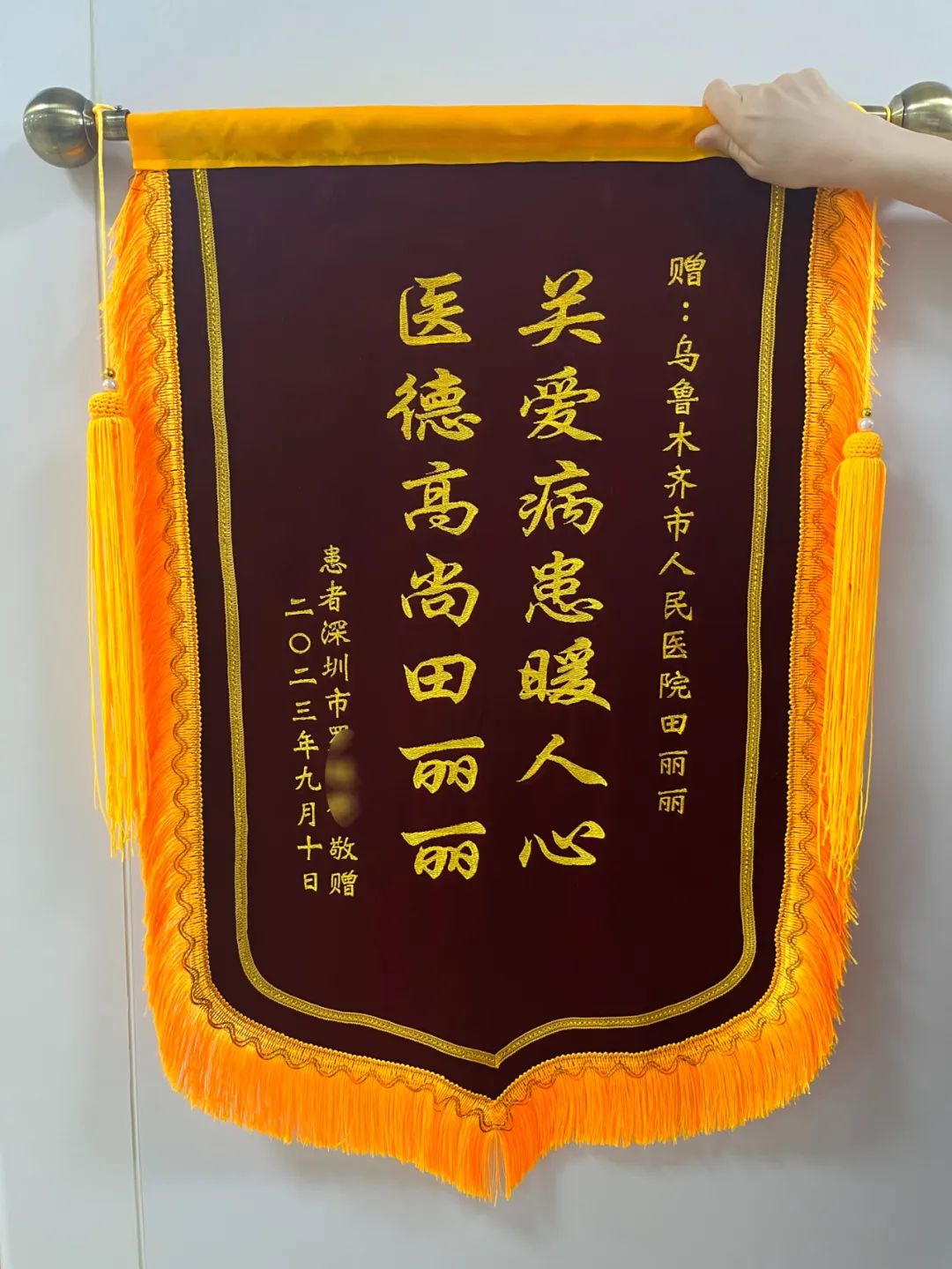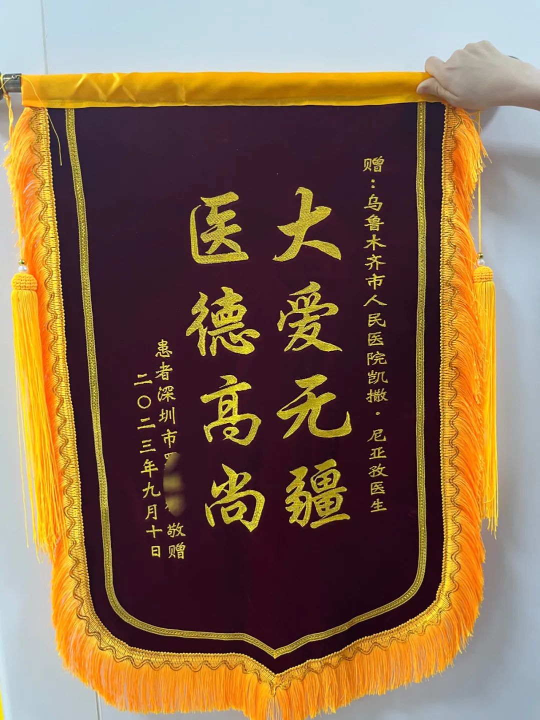 急救中心护士长李玉华疑惑地拆开快递包装,映入眼帘的是两个大红色包装盒,包装精美,里面是两面锦旗,分别赠与乌鲁木齐市人民医院(患者记错了医院名字)医生凯撒·尼亚孜和护士田丽丽,落款人是来自深圳市的患者罗先生,时间是2023年9月10日。