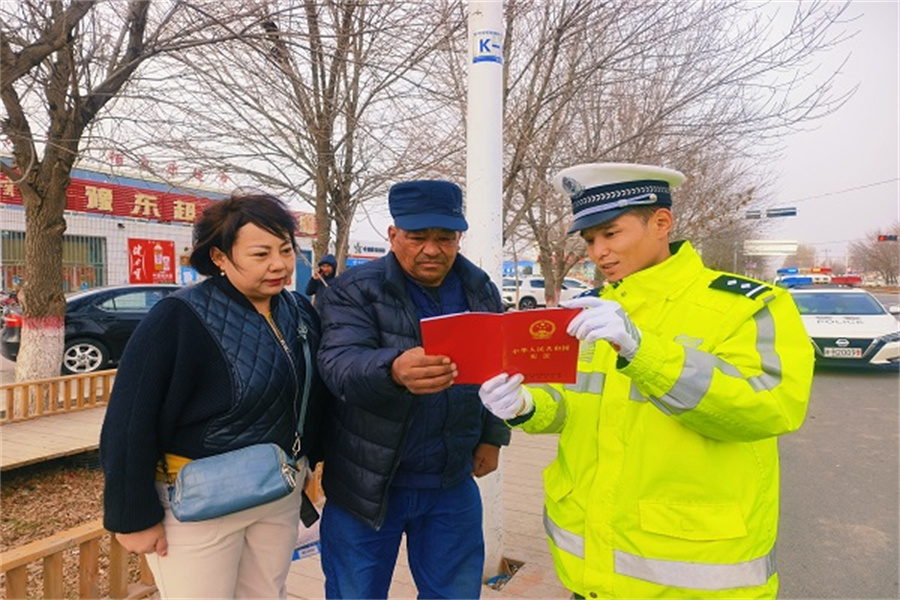 库勒拜镇居民阿依提加玛丽·乌拉尔汗:“今天交警同志给我们宣传了宪法的相关知识,提醒我们上道路驾驶机动车一定要系好安全带,骑乘摩托车带好安全头盔,遵守法律法规,今后我一定遵纪守法,为维护好道路交通环境出一份力。”