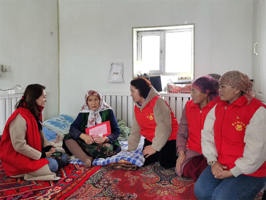 11月14日,照力得汗·瓦里吾拉(右三)和协会的姐妹们来到了哈斯亚·叶尔肯巴义家中,看望患病老人,并送上500元慰问金。 刘雪 摄