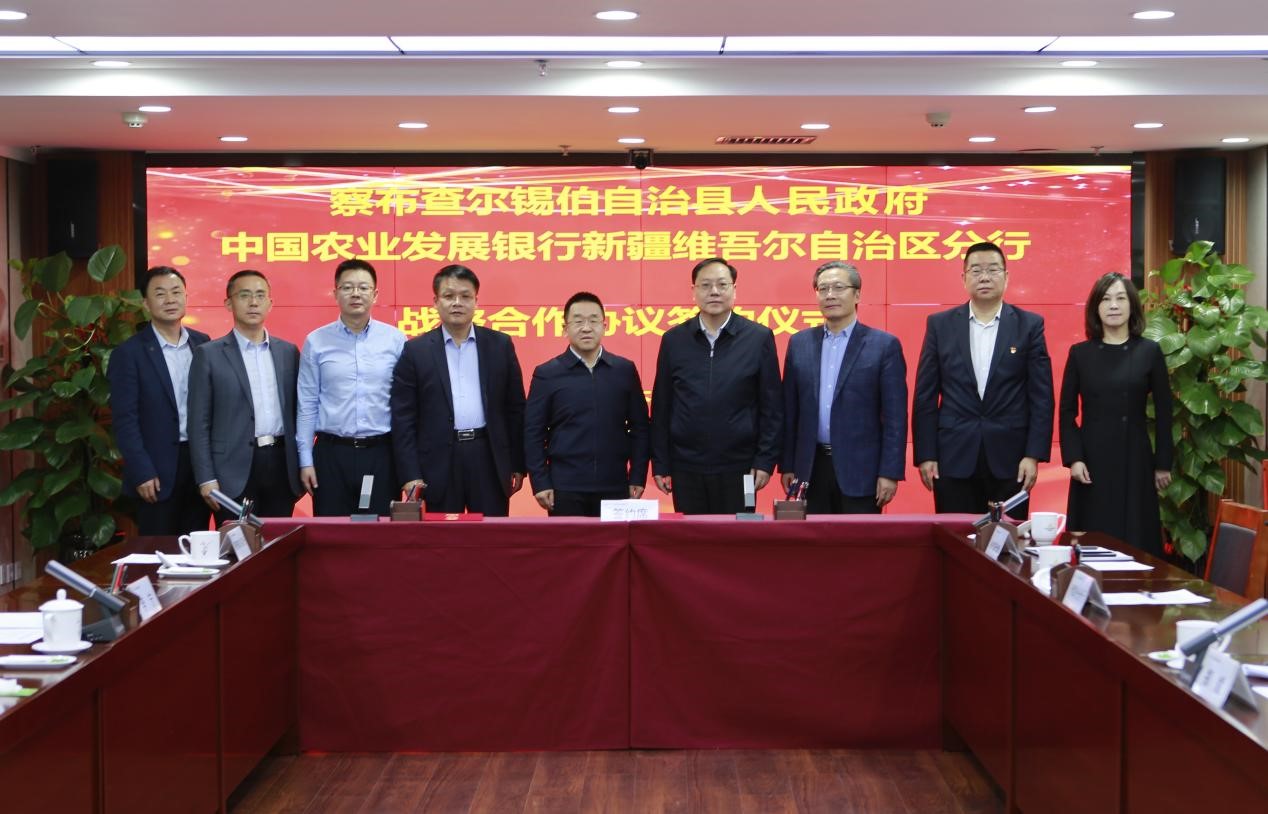 近日,中国农业发展银行新疆分行与伊犁州察布查尔锡伯自治县人民政府在乌鲁木齐市举行《战略合作协议》签约仪式。农发行新疆分行党委书记、行长郑斌,察布查尔县县委书记张煜出席仪式并见证签约;区分行党委委员、副行长王吉献,察布查尔县人民政府副县长李宁代表双方在协议上签字。
