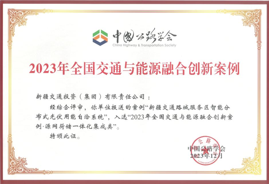 近日,中国公路学会组织召开“碳路中国 绿美通道|首届全国交通与能源融合发展技术交流会”,揭晓“2023年全国交通与能源融合创新案例”评选结果,交投集团报送的创新性成果“新疆交通路域服务区智能分布式光伏用能自洽系统”在全国申报的80余项案例中脱颖而出,入选全国交通与能源融合创新案例“源网荷储一体化集成类”。