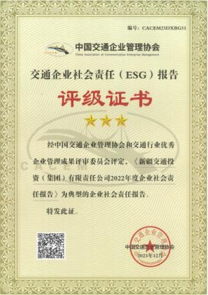 新疆交投集团作为自治区综合交通投资产业集团,积极践行国有企业社会责任,集团2022年度社会责任(ESG)报告成功获得典型报告评级,并在中国交通企业管理协会官网发布。