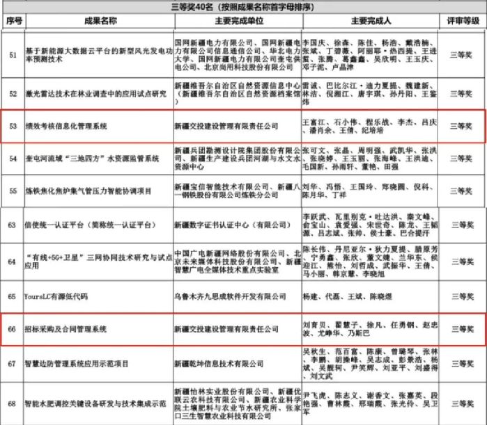 近日,新疆维吾尔自治区2023年第一届数字化科学技术进步奖评审结果出炉,新疆交投建设管理有限责任公司所申报的三项平台均荣获奖项,其中公路建设管理信息化系统荣获二等奖,招标采购与合同管理系统与绩效考核管理系统荣获三等奖。