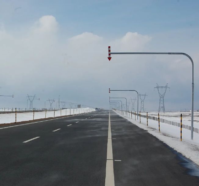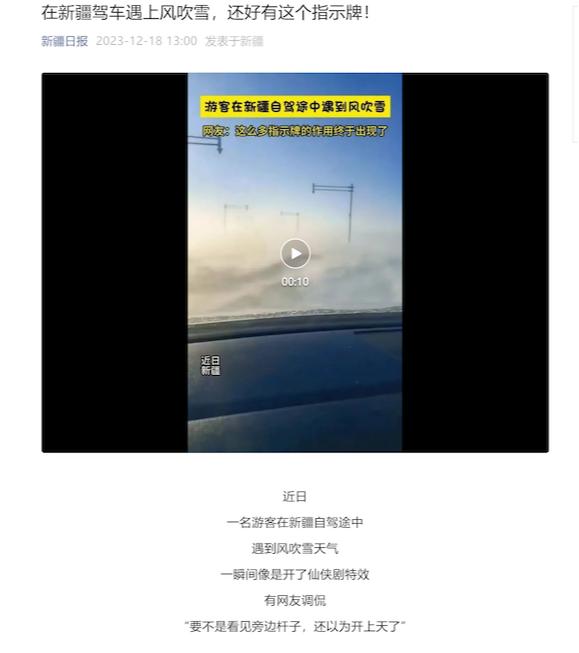 “近日,一名游客在新疆自驾途中遇到风吹雪天气,一瞬间像是开了仙侠剧特效,有网友调侃:要不是看见旁边杆子,还以为开上天了……”新疆日报在“在新疆驾车遇上风吹雪,还好有这个指示牌”文章中这样说到。这个“杆子”“指示牌”就是新交科研发的创新成果——视线诱导标志。