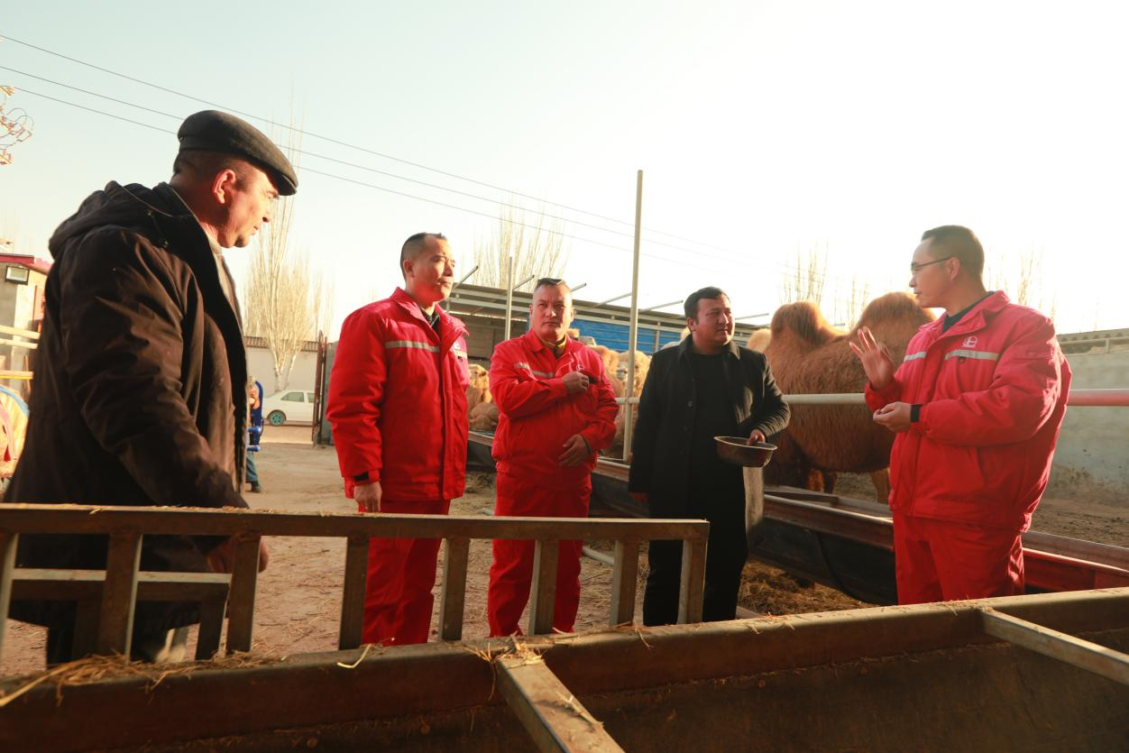 西北石油局驻柯坪县托万巴格勒格村工作队队长、第一书记蒋勇带着队员贾建国、吐尔逊·阿不力孜,来到骆驼养殖场,跟村民们一起做新购骆驼“入圈”前的准备工作。