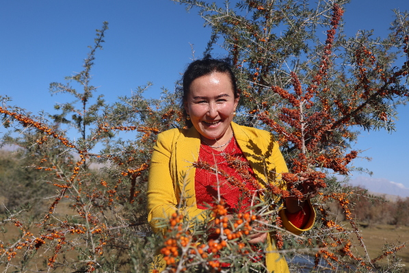 10月16日,在乌什县奥特贝希乡色日克阿热勒村3000亩沙棘采摘区,尤喀克奥特贝希村村民们正在采收沙棘,处处呈现出一片生机盎然、丰收在望的喜人景象。外力·克依木 摄