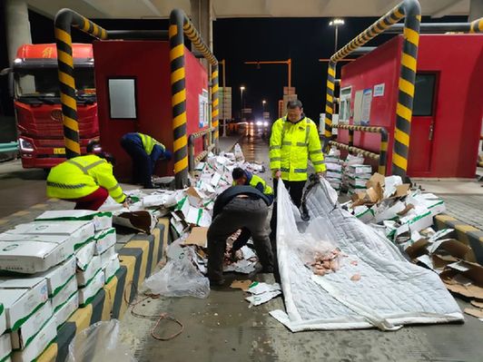 2024年1月14日21时,一辆六型货车进入新疆交投集团吐鲁番分公司大河沿匝道收费站入口ETC车道时,由于货物装载不规范、捆扎不牢固,导致车上装载的50多箱鸭肉在收费车道散落一地。
