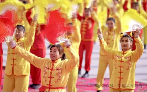 舞者们整齐地挥舞着扇子,形成了一幅动态的画卷。