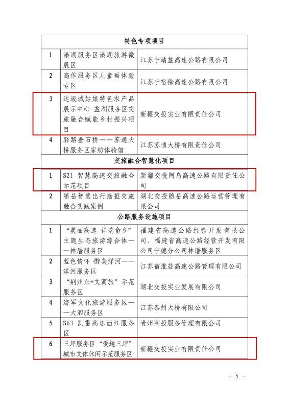 新疆交投实业有限责任公司推荐上报的达坂城姑娘特色农产品展示中心——盐湖服务区交旅融合赋能乡村振兴项目、三坪服务区“爱趣三坪”城市文体休闲示范服务区项目分别入选特色专项类、公路服务设施类全国交旅融合创新项目;