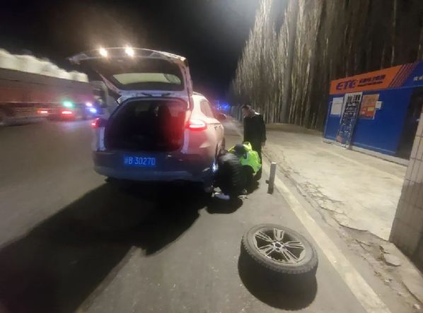 1月30日凌晨5时42分,一辆白色小车停在新疆交投集团吐鲁番分公司库米什收费站入口外广场,正在疏导车辆的执勤人员艾力夏提·艾尼娃尔看到停留车辆急忙上前询问情况,得知车子突然爆胎,司乘人员自己换不了轮胎又对周围不熟悉,就只好把车停在外广场。