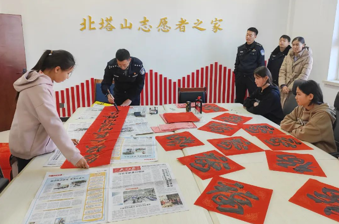 在北塔山志愿者之家,机关党支部书记曹晨曦和志愿者共同为当地群众写春联、送祝福,现场墨香四溢,一横一竖一撇一捺之间、一起一落一快一慢之际,大红“福”字跃然纸上,写出了新春之际喜悦的气息和与“家人”之间浓厚的感情。