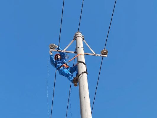 线路周围荆棘丛生,地势坑坑洼洼,大大增加了故障排查抢修的难度,但所有人员努力克服不利条件,做好自身防护,首先对故障线路进行停电、验电作业,确认故障线路无电压后,抢修人员佩戴安全带、脚扣攀爬至绝缘瓷瓶及输电线掉落位置,使用安全绳将绝缘瓷瓶及输电线恢复至原有安全位置,拆除已损坏的绝缘瓷瓶,安装新绝缘瓷瓶,固定输电线。经过不懈努力,最终圆满完成更换绝缘瓷瓶和固定电线工作任务。