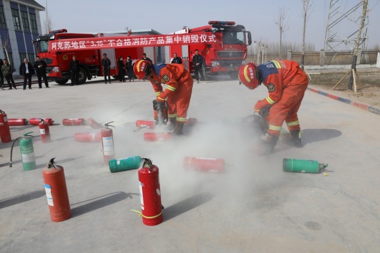 在“3·15”国际消费者权益日来临之际,3月13日,新疆维吾尔自治区阿克苏地区消防救援支队联合市场监督管理局在温宿县举行了“3·15”不合格消防产品集中销毁仪式。