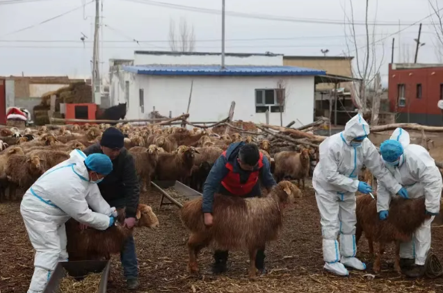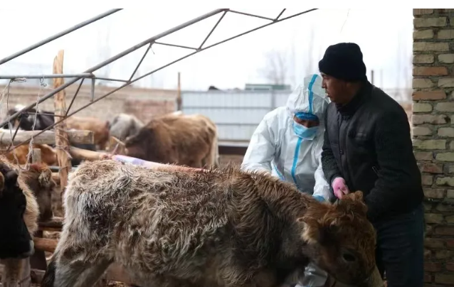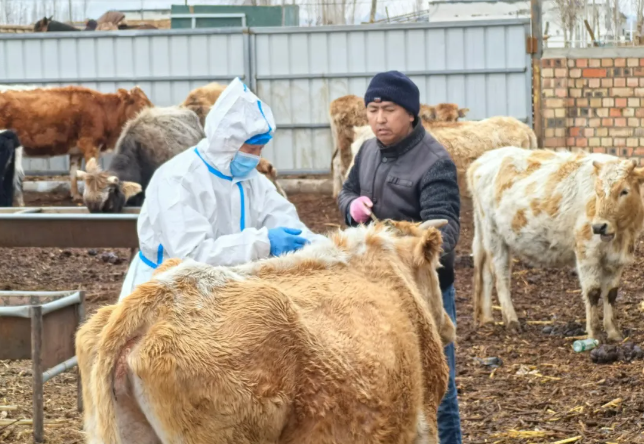 近日,在博乐市贝林哈日莫墩乡贝林哈日莫墩南村村民吐拉安·托列吾汗家中,村级防疫员和乡畜牧兽医站工作人员一起开展春季牲畜疾病防控检查,一边装针,为养殖的牲畜注射口蹄疫免疫疫苗,一边结合春季动物防疫工作要求,开展宣传。