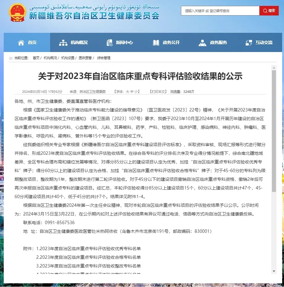 2023年10月至2024年1月,自治区卫生健康委启动了第二轮自治区临床重点专科评审、挂牌工作,涉及历年建设的自治区临床重点专科项目中的消化内科、心血管内科、儿科、耳鼻喉科、药学、产科、检验科、临床护理、感染病科、神经内科、肿瘤科、医学影像科、呼吸内科、肾病科、普外科15个专业。图片