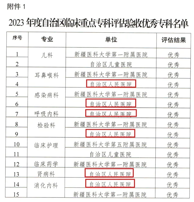 近日,新疆维吾尔自治区卫生健康委公布了2023年自治区临床重点专科评估验收结果,新疆维吾尔自治区人民医院耳鼻喉科、感染病科、呼吸内科、检验科、肾病科和消化内科专业获评自治区临床重点专科评估验收优秀专科。