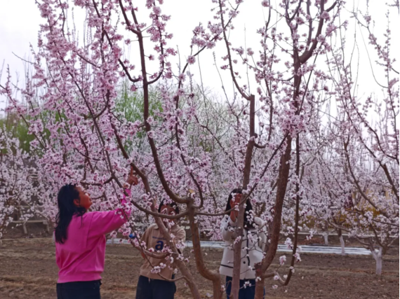近日,位于喀尔曲尕乡阿瓦提村的“庭院经济+杏树”示范片区,几个姑娘正在开心地欣赏杏花,一朵朵粉白相间的杏花灼灼其华,真是“人面杏花相映红”。