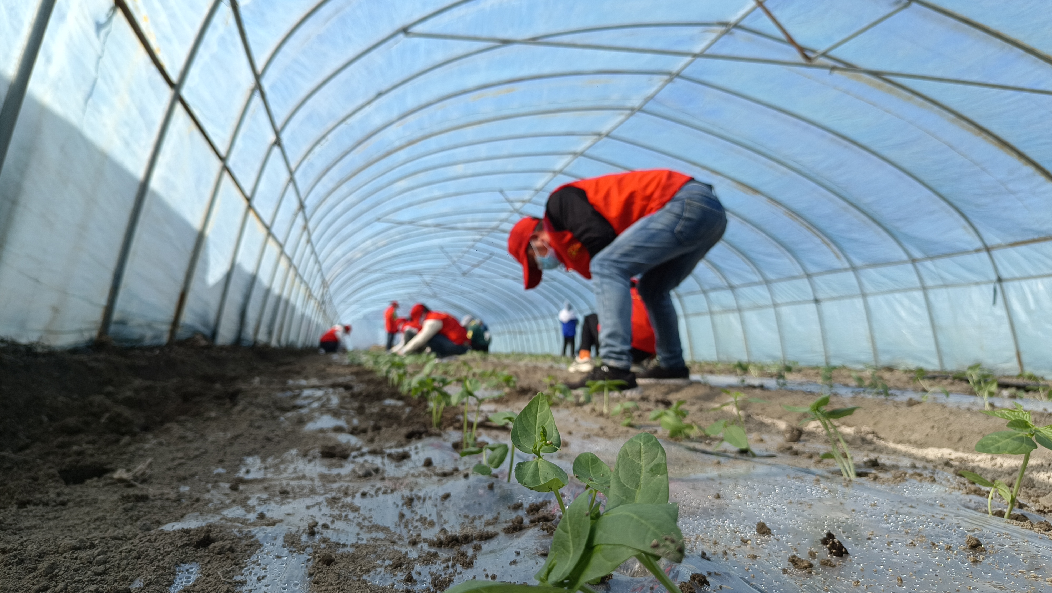为了尽快完成种植,他雇佣了本村十多名务工人员在大棚内帮忙赶工期。