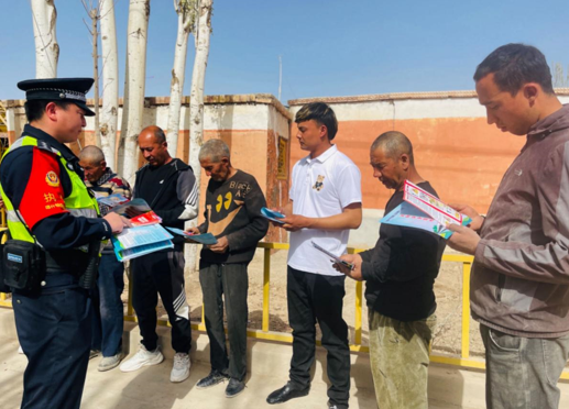民警向群众发放《铁路安全管理条例》。摄影:娜扎凯提