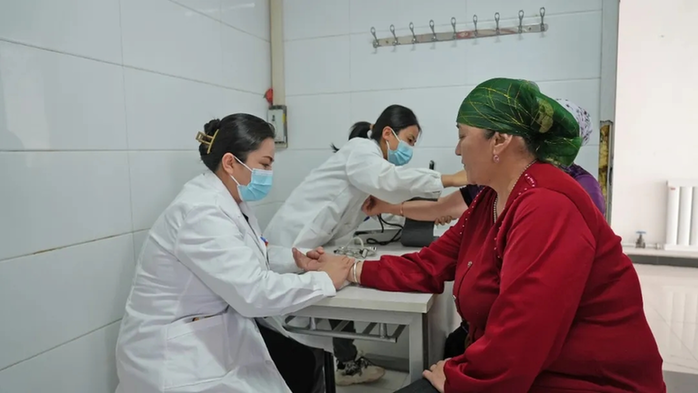 塔斯巴斯陶村村民努尔古丽·卡尔努说:“库镇卫生院医生来到我们村,给我们提供针灸、量血压、拔罐等服务。以前我们还要去县城就诊,现在就在我们村里,特别方便,感谢他们。”