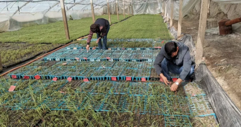 为解决当前罗布麻优良品种匮乏,选育适合罗布麻产业药用、茶用和纺织的品种,挂职副县长姜黎带领县林业局技术专家一行跑遍天山南北,收集罗布麻种质资源,数量达100余个。为让每一个罗布麻种质都生根发芽,技术人员从温室大棚育苗,到幼苗成长,每一阶段都精心呵护。如今,一盘盘青翠的罗布麻苗正源源不断地运往各个种植点。