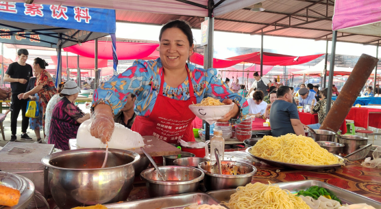 记者在美食区看到,各种烤肉、烤包子、面肺子香气四溢,让人垂涎欲滴,前来尝试的顾客络绎不绝,各美食摊位上摆满了各种各样的商品,市场一片繁忙的景象。阿米娜·赛买提是阿恰塔格乡布干村村民,十年来,每个星期三她把自己做的凉粉拿到依麻木镇农贸市场去卖,收入很可观。