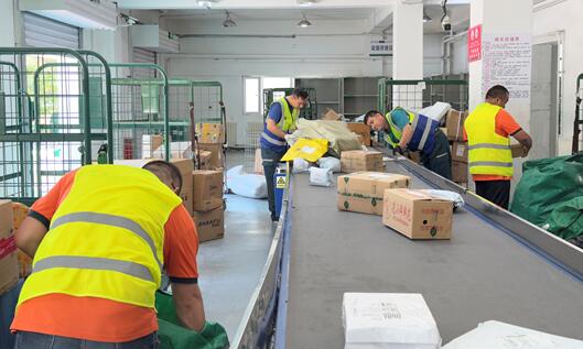 5月16日上午,在博州邮政分公司邮件处理中心,工作人员正在对新到达的快递进行卸货,揽投员们正熟练地将包裹分拣到各个区域,准备送往目的地。