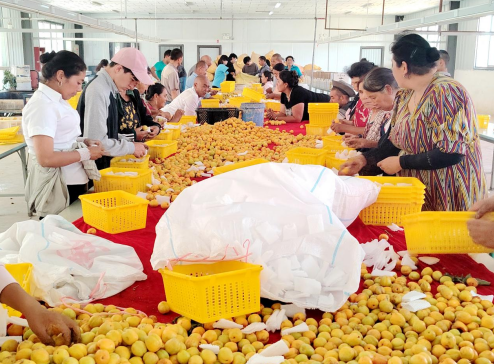 6月26日,在色提力乡托万霍伊拉(10)村果农阿尔祖古丽的杏园里,金灿灿的果实缀满枝头,她正按照订单要求进行采摘、分拣、包装当天销售的鲜杏。