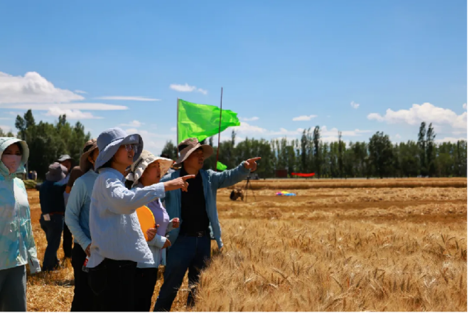 7月5日经由农业农村部小麦专家组测定博乐市小营盘镇哈日莫墩村种植的冬小麦高产示范攻关田亩产851.42公斤喜获丰收