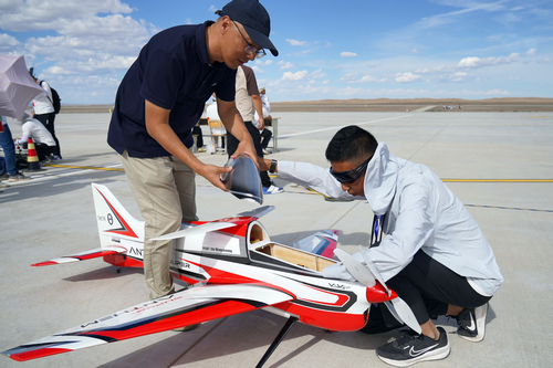 两名选手在赛场上紧急检修飞机。克拉玛依融媒记者 李浩然 摄