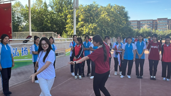 活动现场氛围融洽,同学们从陌生到熟识,从拘谨到活跃,一个个热情高涨、笑容洋溢,积极参与并享受其中。实践队员迪丽热巴·买合木提、帕丽扎提·亚生江和学生带来的维吾尔族舞蹈将活动推向高潮,同学们纷纷鼓掌喝彩,一同加入到欢快的舞蹈中。
