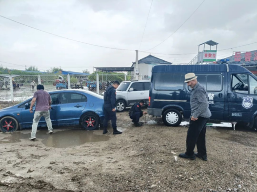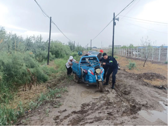7月13日,岳普湖县公安局特警大队在阿其克乡巡逻防控过程中,发现群众车辆不慎驶入路边泥坑,动弹不得,巡逻民辅警立即上前查看并了解情况。据了解,驾驶员因着急出行未注意前方泥坑,由于雨天路面湿滑,车子不慎打滑深陷泥坑,经驾驶员多次尝试仍无法将车辆移出。巡逻民辅警见状立即展开救助,将警车开到被困车辆的前方,用拖车绳连接被困车辆,让驾驶员在驾驶室掌握方向,并发动附近群众合力推车,齐心协力将车辆推出泥坑,脱困后,驾驶员们紧紧握住民辅警的手,一再表示感谢。