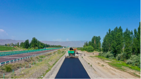 精河县大河沿子镇Z572线施工现场,沥青摊铺机和压路机在同步施工作业。