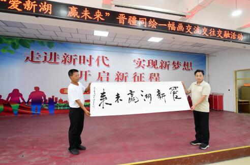 擅长书法的梁春书还与兵团六师新湖农场的书法爱好者现场交流心得,分享了他对书法艺术的感悟和理解。他还应新湖农场的要求,热情地为兵团六师新湖农场写下了“爱新湖 赢未来”的墨宝。