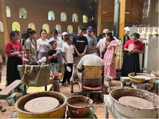 芒辛镇托万艾日克村返乡学生观看土陶匠人制作土陶。