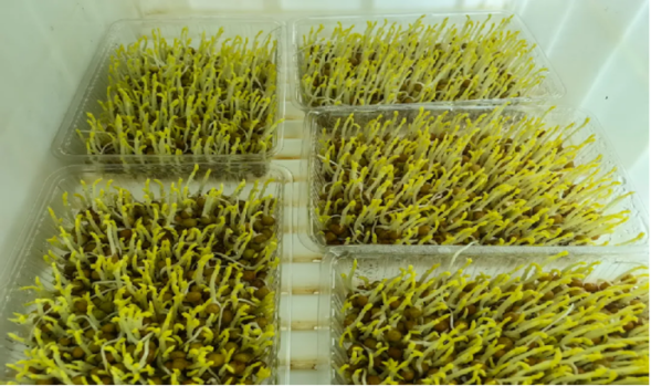 在无菌育苗室,室内无土栽培智慧方舱里的新鲜芽苗晶莹剔透,尽显生机。新疆汉博现代农业发展有限公司负责人汤凯峰介绍,培育芽菜用的是富氢、富氧水技术,引进全自动增氧控温浸种、催芽箱等技术设备,培育过程无任何添加剂及化学制剂。 据了解,在一期项目实施计划中,企业计划截至明年3月,完成辣椒酱、香辣牛肉酱、酸辣豇豆酱、香菇酱、米粉酱、火锅底料等酱料产品100万瓶。同时,稳定企业有机芽苗菜及菌菇方舱种植。