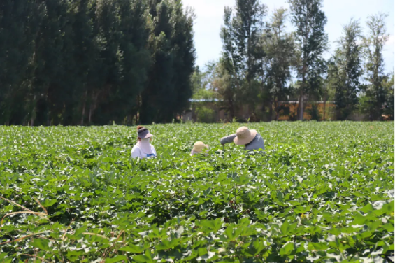 在精河县茫丁乡肖乃村棉农徐铁成家的500亩棉田里,州县农业技术人员规范选点,采取查、量、数等方法测苗株数、苗铃数、科学测算棉花的产量。