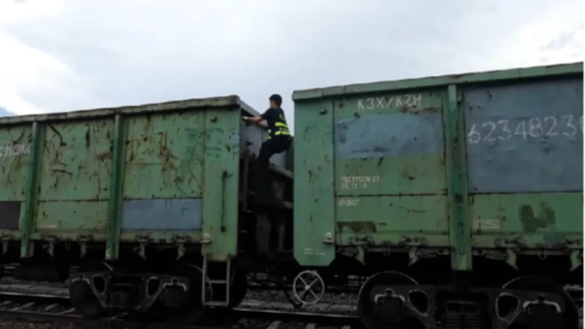 在阿拉山口出入境边防检查站铁路宽轨执勤现场,民警杨武在查验入境列车。(靳婷婷 摄)