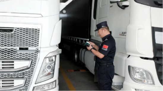 验证入境货运车辆外籍驾驶员身份。(靳婷婷 摄)