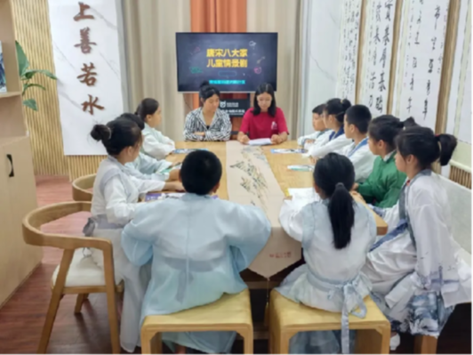 活动过程中,小朋友被分配到不同唐宋诗人的角色,他们身着传统服饰,化身为小韩愈、小柳宗元、小欧阳修等唐宋八大家中的书生或才女。通过沉浸式角色扮演,让孩子们切身了解到诗人的生平经历和文学创作背景,在游戏中品味唐诗宋词的魅力,埋下一颗兴趣的种子。经过破冰游戏、自我介绍、团队协作等丰富有趣的环节,小朋友们的阅读总结和表达能力得到有效锻炼,对于同伴之间交流合作的认识也不断增强。