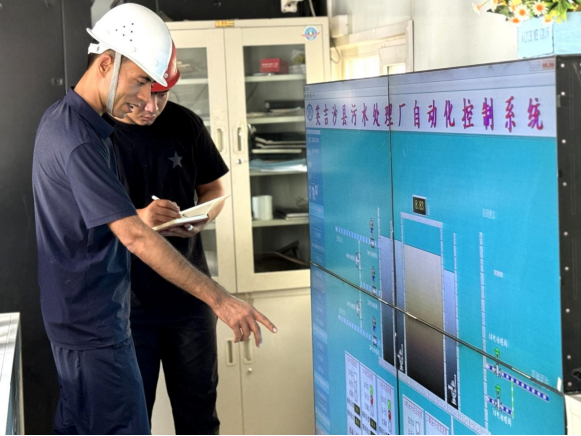 技术人员实时查看记录污水浊度、氨氮、总磷等参数。娜扎凯提摄