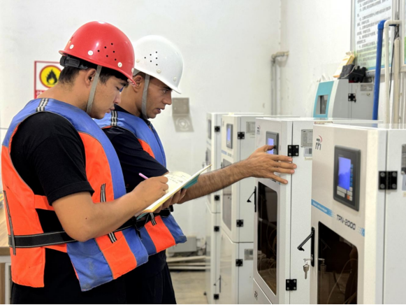 技术人员查看记录总控室运行情况。娜扎凯提摄