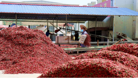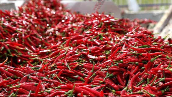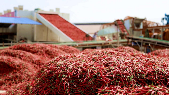 又是一年丰收季,走进莎车县拍克其乡辣椒种植基地,火红的辣椒如同灯笼般点缀枝头,村民们正忙着采摘、打包、搬运,现场一派好“丰”景。农产品精深加工一头连着农业、农村,一头连着工业、市场,是推进乡村全面振兴和发展县域经济的重要支撑。除了田间地头一派火热,在喀什汇红农业发展有限公司的辣椒厂里,同样热火朝天。车间内,火红的辣椒堆积如山,“辣”味扑鼻而来,工人们熟练操作着设备,进行分拣、搬运、烘干等工序。经过除杂、脱粒、剪把、色选、烘干等一系列流程,新鲜的辣椒最终被打包入库,准备销往市场。