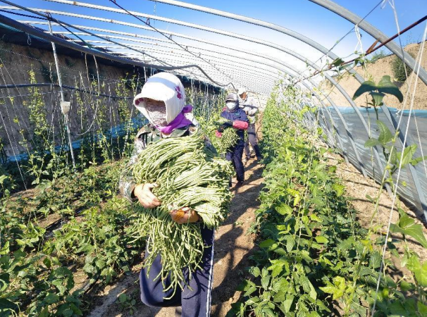 眼下,正值豇豆的盛产期。在第六师芳草湖农场三十三连五家渠众联农业农民专业合作社蔬菜大棚内,清新气息扑鼻而来。一垄垄豇豆郁郁葱葱,工人们穿梭在豇豆架下,忙着采摘成熟的豇豆,大棚内呈现出一派热闹的收获景象。