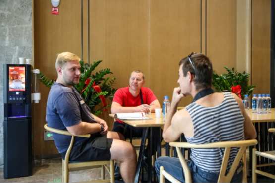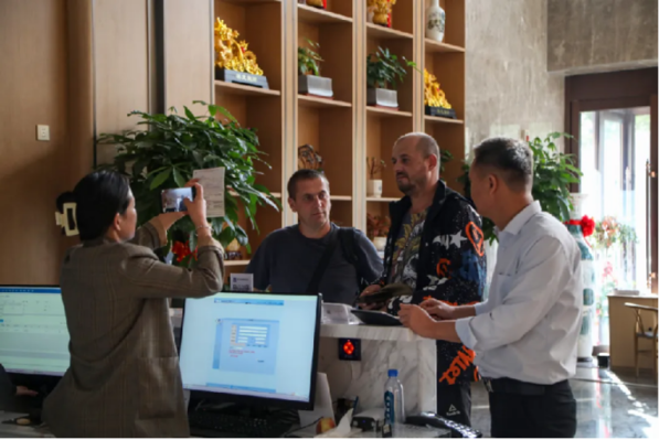 “Здравствуйте!(俄语您好!)”酒店总经理于永飞身着衬衫西裤,笑容满面地开门迎客。见前台正有人员办理入住,他示意几名外籍人员稍作休息,又贴心地递上几杯热咖啡。
