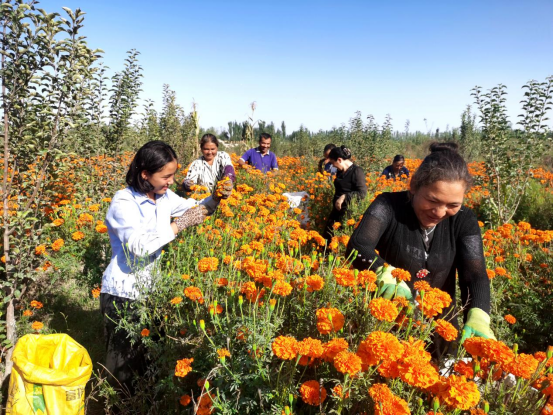 吐尔库依(11)村今年种植万寿菊350余亩,由于管理到位,从6月底就开始采摘,该村通过政策引导、技术服务、订单种植,形成完整的“产、供、销”模式,让赛威迪古丽·喀迪尔等村民见到实实在在的效益。赛威迪古丽·喀迪尔说:“万寿菊可以一直采摘到10月底,明年我们准备多种点,科学管理,增加收入。”