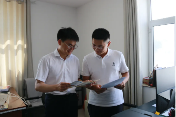 银行工作人员(左)向企业宣传相关政策。
